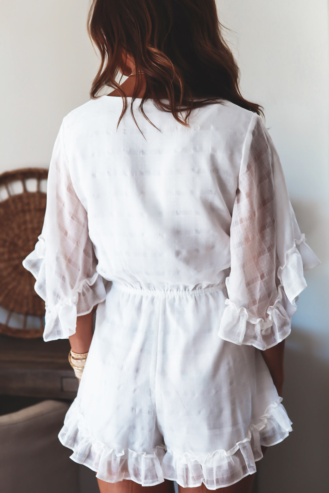 The sweetest and chicest white front bow tie romper with ruffle details. Classic white romper with textured print on the white fabric. Sheer sleeves. Rest of romper is lined. Mini elastic waist. No zipper or button closure. Just slip on.