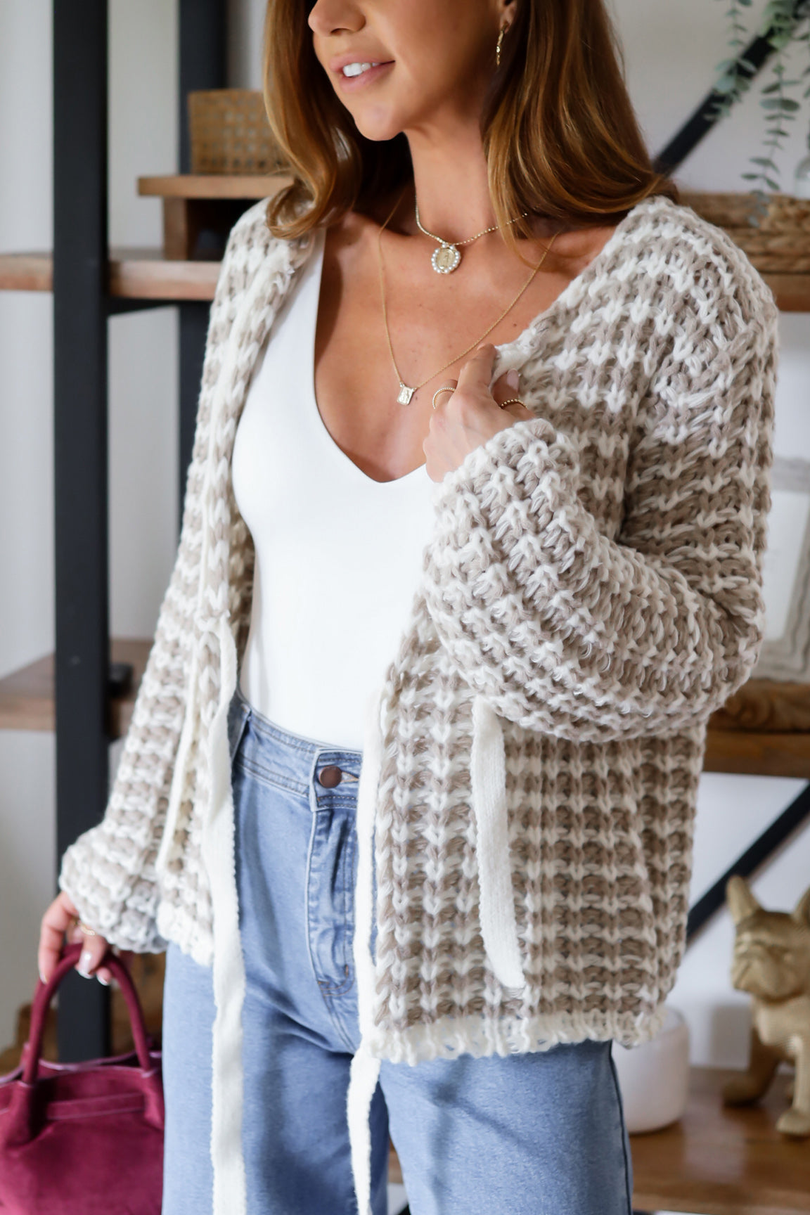 Cozy and effortlessly chic — this open-knit cardigan is the kind of layer you’ll reach for again and again. Designed with a relaxed silhouette and airy cotton knit, it drapes beautifully over a cami or tank for that easy, put-together look. The front tie detail adds a soft, feminine touch while letting you style it open or loosely tied depending on the vibe. Perfect for transitional days, coffee dates, or throwing on when you want something cute.