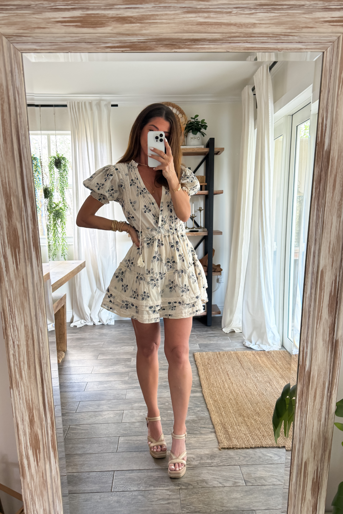 The Brielle Dress is pure girly charm. With soft puff sleeves, navy embroidery, and dainty lace details, it feels playful and pretty in the best way. The elastic waist and tassel ties give it an easy, flattering fit, while the ruffle tiers add just the right amount of movement. It’s the kind of dress you put on and instantly feel cute in—simple, sweet, and made to be worn on repeat.