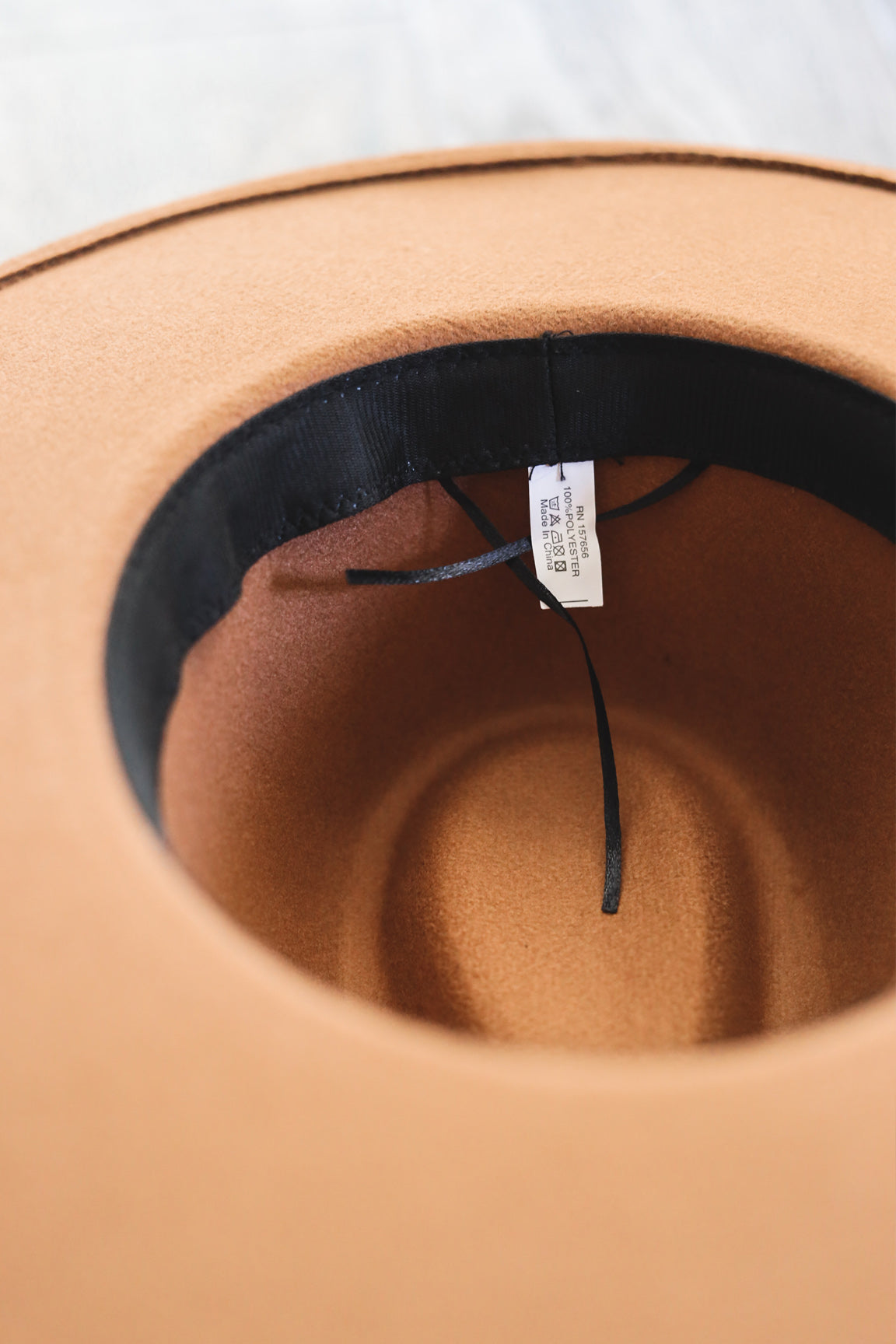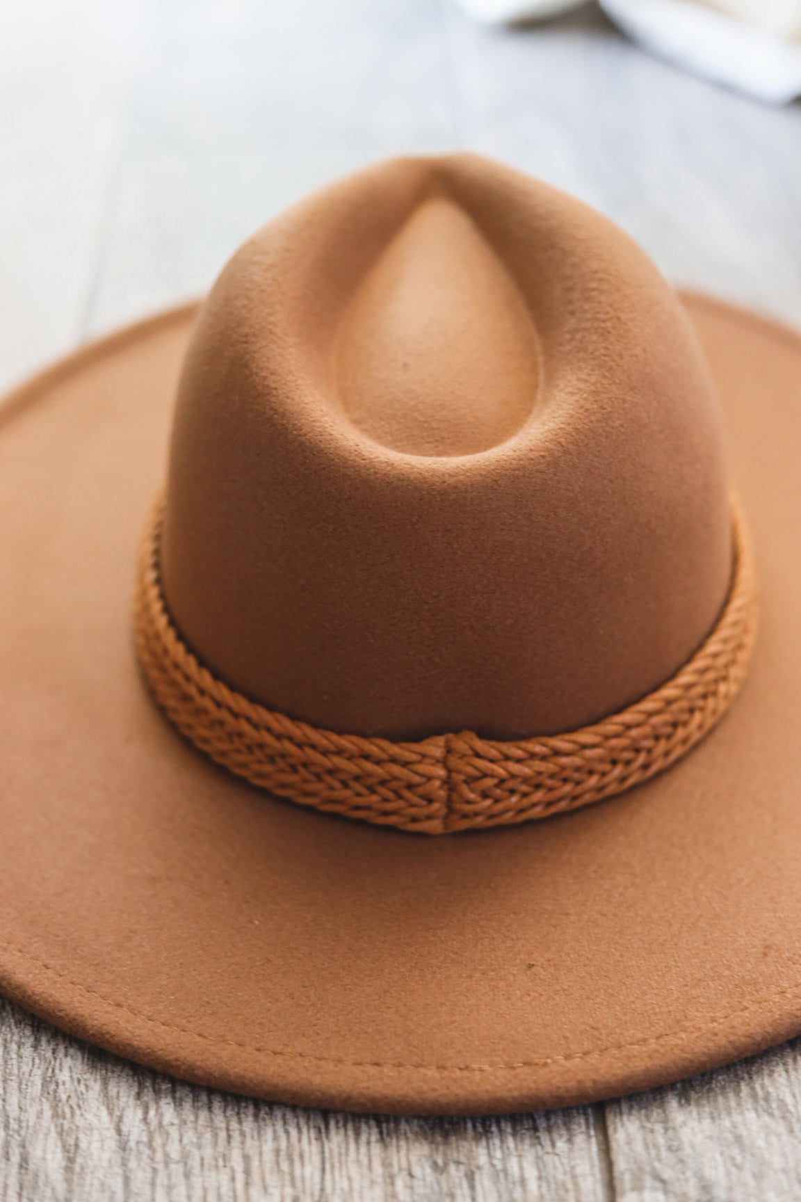 Fedora de fieltro de color canela intenso con ribete trenzado de piel sintética. Interior ajustable con cordón.