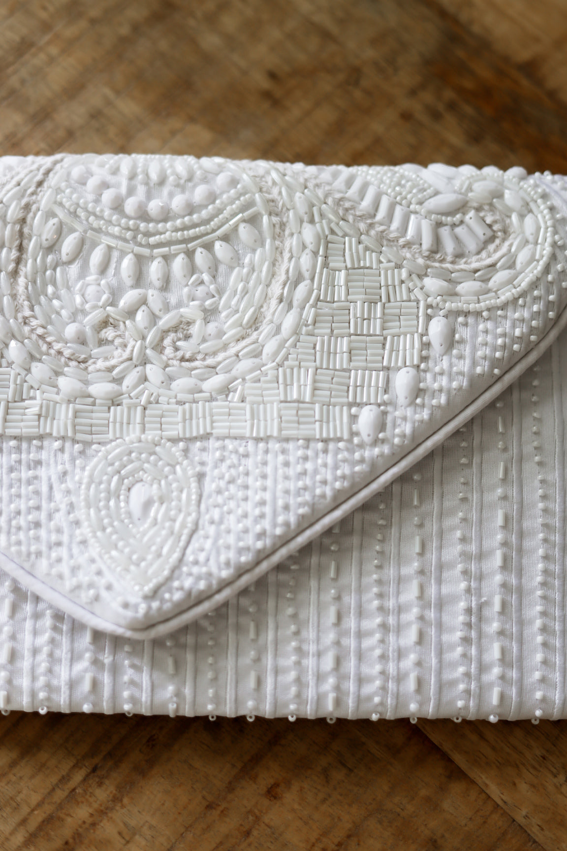 A soft, statement piece that feels equal parts timeless and romantic. This intricately beaded clutch features delicate ivory tones layered with ornate, hand-placed detailing that catches the light in the most subtle, beautiful way.