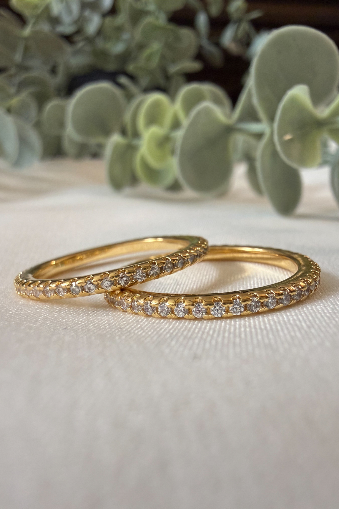 - Eternity-style band with full-circle pavé stones